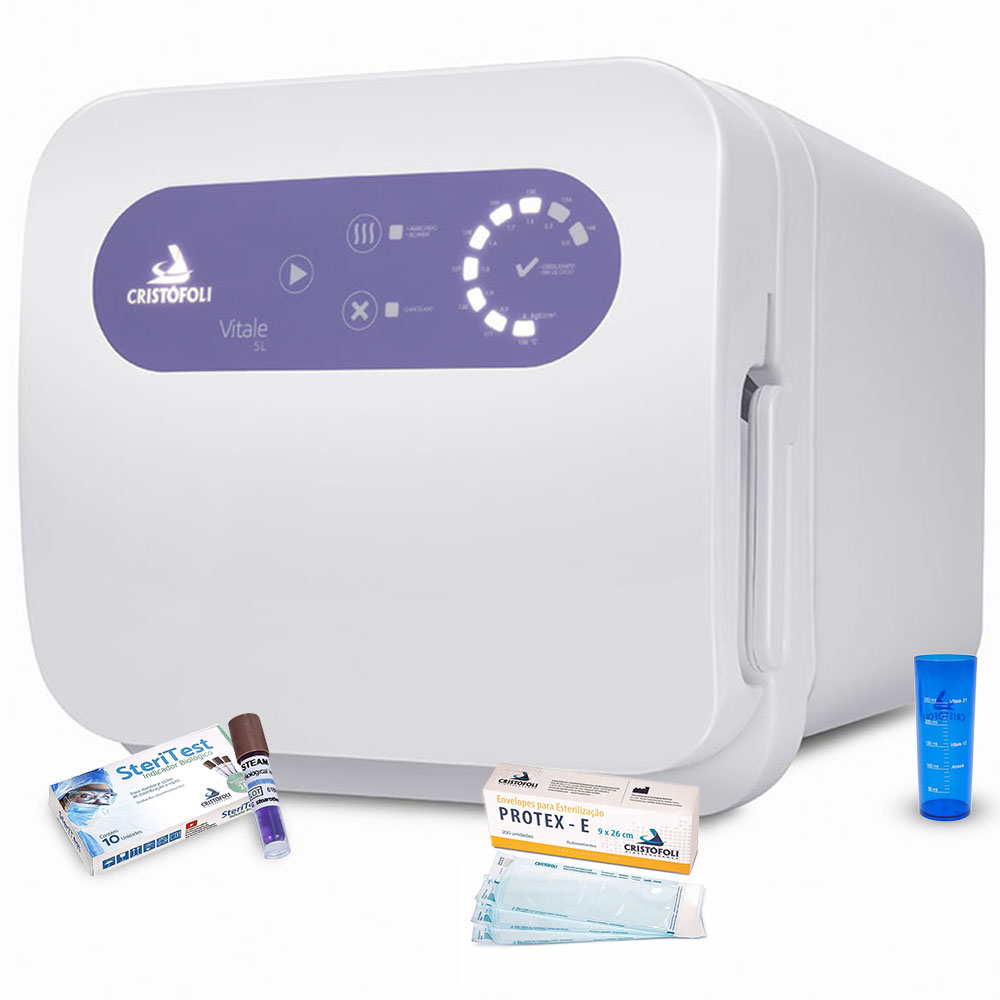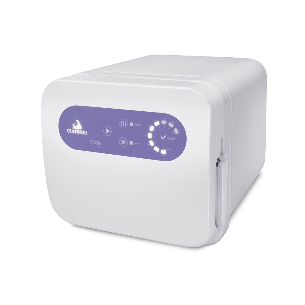 Autoclave Cristófoli Vitale 5L Classe S na cor branco/lilás, desenvolvida para estabelecimentos de pequeno porte que exigem esterilização profissional. Com 21 sistemas de segurança integrados e programa único de esterilização, oferece praticidade e confiabilidade para salões de beleza, clínicas de podologia e estúdios de tatuagem.