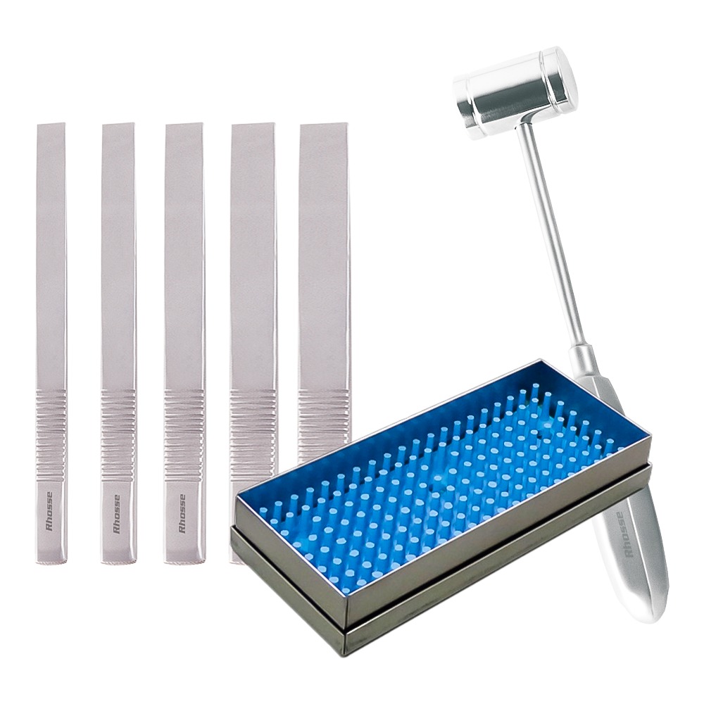 Kit completo para procedimentos ortopédicos, incluindo 5 cinzéis de mão, martelo e estojo, todos confeccionados em aço inox 304 de alta qualidade. Instrumentos autoclaváveis, garantindo esterilização eficiente e reutilização segura em centros cirúrgicos e hospitais. Ideal para cirurgiões ortopédicos que exigem precisão, durabilidade e organização em suas ferramentas.