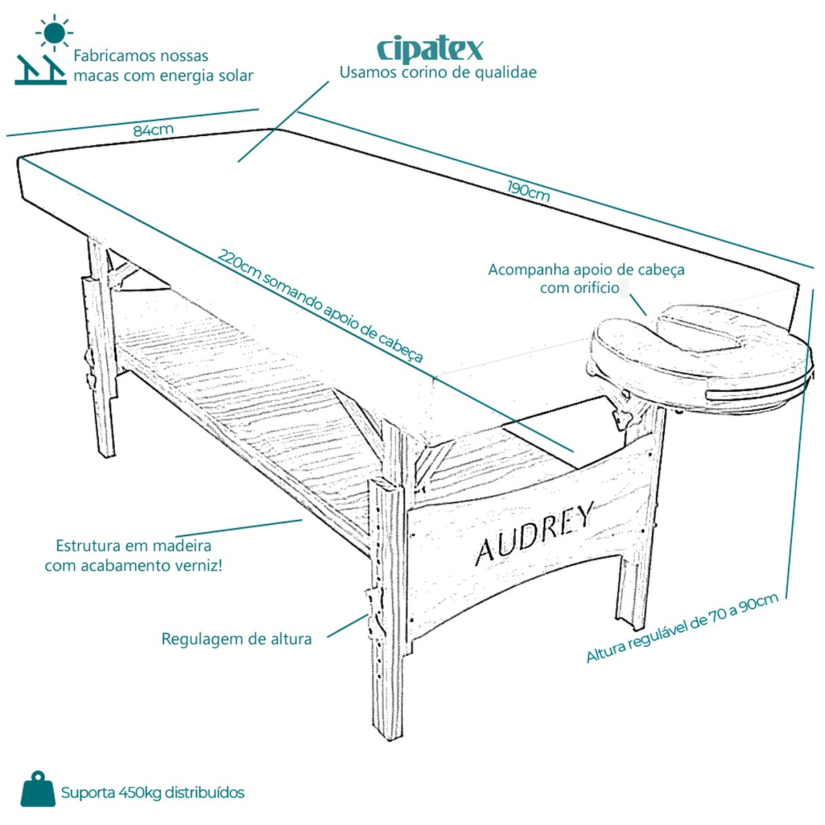 Fabricante líder no segmento de macas estéticas, a Audrey utiliza madeira alemã Beech de alta resistência e processos sustentáveis com energia solar. Todos os produtos possuem tratamento anticupim e antimofo, com acabamento impecável que atende aos profissionais mais exigentes.