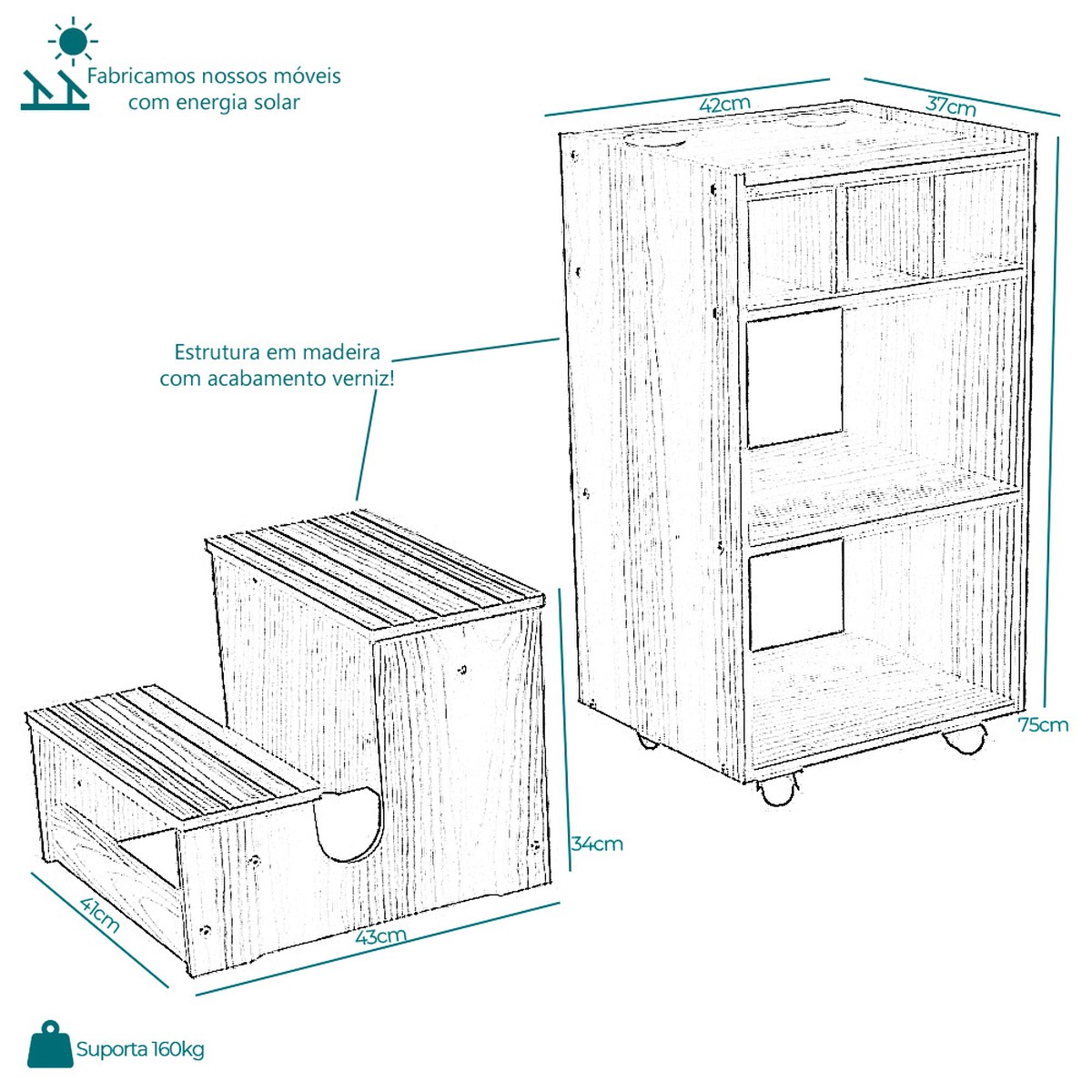 O conjunto inclui a consagrada Maca Fixa Plus, o prático Carrinho Auxiliar e a Escadinha, todos fabricados na mesma tonalidade para uma harmonização visual perfeita.